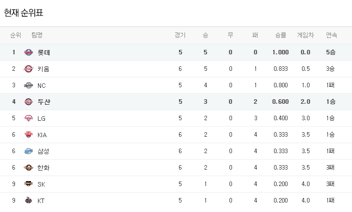 KT 상대로 연장 끝에 힘겨운 승리를 거둔 두산. 3승2패로 첫 주를 마무리한 가운데 함덕주-이형범까지 흔들렸다는 것이 우려된다. 김승회,김강률 같은 불펜 자원들이 빠진 상황에서 필승조 까지 흔들리면 젊은 선수들이 많은 불펜이 도미노처럼 무너질 가능성이 있을 듯. 다만 .591의 타율을 기록하고 있는 페르난데스의 맹타에 지난 시즌과는 다소 변한 것으로 보이는 공인구의 효과를 톡톡히 볼 수 있는 타자들이 많다는 점. 특히 지난 시즌 극심한 부진을 겪은 김재환이 벌써 2개의 홈런을 때리며 살아나고 있는 만큼 타격의 힘을 기대할 수 있을 것으로 보여진다. 더불어 개막전에서 성급한 투구로 패전투수가 되기는 했지만 150km의 빠른 공을 앞세운 알칸타라의 구위가 좋은 상태라는 점도 기대해볼 만하다.