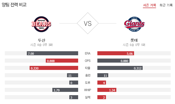 두산은 초반부터 타격이 터지면서 리드를 잡았지만 5회 대수비로 나온 류지혁의 실책으로 동점을 허용하면서 경기가 꼬였다. 9회초 오재일의 동점홈런으로 승부를 원점으로 돌렸지만 9회말에 올라온 마무리투수 이형범이 초구에 끝내기홈런을 맞아 2경기 연속 불안한 모습을 보여주는 등 필승조 까지 흔들리고 있다는 것이 우려되는 부분. 다만 페르난데스,오재일,김재환 등 좌타자들의 타격감이 워낙 좋고 LG전 6이닝 3실점을 기록하며 KBO 데뷔전 승리를 거둔 외국인 투수 크리스 플렉센의 구위나 제구가 나쁘지 않은 만큼 처음 상대하는 롯데 타자들을 어느정도 막아줄 수 있을 것으로 보여진다.