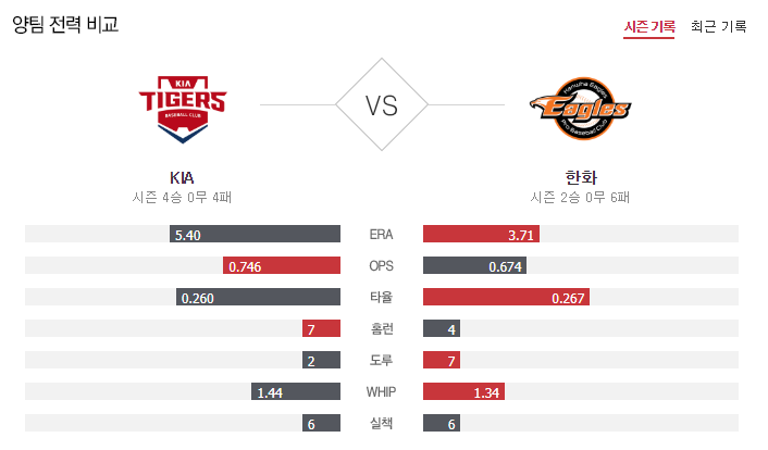 한화는 9회말 1사 만루 찬스를 살리지 못하고 2경기 연속 1점차 패배를 당했다. 선발투수 장시환이 6이닝 4실점 3자책 호투를 펼쳤으나 2경기 연속 무안타에 그친 송광민,김태균의 부진에 중심타선이 터져주지 않으면서 6회 이후 올라온 기아 불펜을 공략하는데 실패했다. 키움전 3연패에 기아전 2연패로 5연패 늪에 빠진 가운데 스윕 위기에서 선발투수 장민재가 등판한다. 첫 등판에서 5이닝 3실점으로 나쁘지 않았고 지난 시즌 기아전 3경기 1승1패 2.87로 좋은 성적을 기록했지만 안정적인 선발진에 비해 불안한 불펜과 타선의 응집력 부족이 발목을 잡고 있다는 것이 문제다.