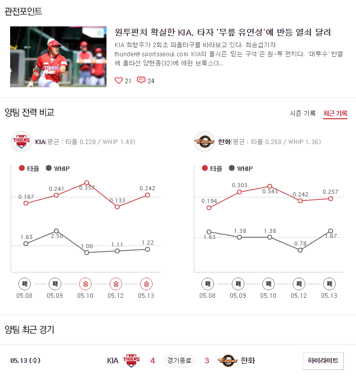 기아는 마무리투수 문경찬이 이틀 연속 불안한 모습을 보였지만 끝내 1점차 리드를 지켜내면서 파죽의 3연승을 달렸다. 선발투수 이민우가 5이닝 3실점으로 버텨줬고 박준표-전상현-문경찬으로 이어지는 기아의 필승조가 무실점으로 경기 후반을 책임져주는 모습. 특히 1차전 시즌 첫 홈런을 기록한 나지완이 멀티히트를 기록하며 한화를 상대로 타격감이 살아났다는 것이 고무적이다. 나지완이 이번 시리즈의 활약을 꾸준히 보여준다면 기아 타선도 나름대로 경쟁력을 갖출 수 있을 듯. 선발투수로는 삼성전 5.1이닝 4실점 3자책으로 패전을 기록한 외국인 투수 드류 가뇽이 등판하는 가운데 체인지업을 주무기로 하는 투피치 투수라는 점에서 애런 브룩스와 달리 한화 타선을 압도하기 어려워 보인다. 특히 전상현,문경찬이 이틀 연속 등판해 접전 상황에서 1,2차전과 같은 필승조 가동이 어렵다는 점이 변수다.