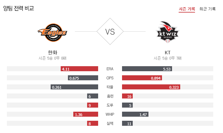 장단 18안타를 몰아치며 6회까지 13-1로 앞섰던 KT. 7회초에 올라온 박세진이 0.1이닝 4실점을 허용하는 등 불펜이 대량실점을 허용하며 12점차 리드 경기에서 주권-이대은이 등판한 끝에 힘겹게 승리했다. 불펜이 다시 한 번 흔들렸다는 것은 아쉽지만 삼성과의 시리즈에서 살아난 타격감이 한화를 상대로도 화끈하게 폭발했다는 점은 고무적인 부분. 특히 유한준이 부상으로 빠진 공백을 조용호가 .579의 타율을 기록하며 손색없이 메워주고 있고 시즌 5호홈런을 기록한 강백호의 타격 페이스도 심상치 않아 보인다. 선발투수 배제성이 2경기에 등판해 아직 승리를 기록하지 못하고 있는 상황이지만 롯데,NC 상대로 2경기 1.35로 자신감 넘치는 투구를 보여주고 있고 지난 시즌 한화전 1승2패 1.83으로 승운은 따르지 않아도 매우 강했다는 것도 기대해볼 만하다.