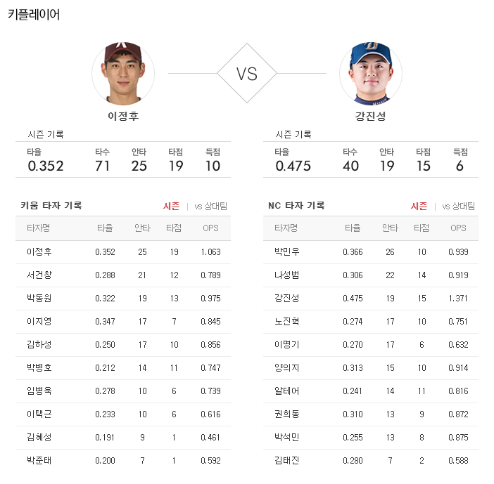 핸디캡: 두 팀 모두 언더핸드 투수가 등판하는 가운데 선발투수 두 명 모두 상대팀과의 전적이 좋지 않다. 다만 키움이 이번 시즌 언더핸드 투수 상대로 고전하고 있고 최근 타격감이 워낙 좋지 않은 상태라는 점에서 NC의 핸디캡 승리를 예상한다.
