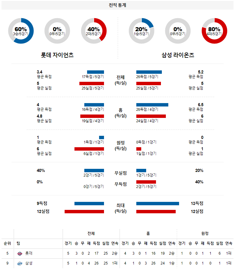 롯데는 5일 휴식 등판에 나선 스트레일리의 호투에 필승조가 완벽한 모습을 보여주며 8회말에 나온 이대호의 결승타를 지켜냈다. 키움전 위닝시리즈에 이어 2연승을 기록하며 다시 한 번 분위기를 끌어올리는 모습. 전체적인 타자들의 타격감은 시즌 초반에 비해 떨어진 가운데 특히 하위타선이 무기력하다는 것이 아쉽지만 수비형 포수 정보근과 메이저리그급 수비를 보여주고 있는 마차도의 가세로 내야수비가 안정됐다는 점이 눈에 띄게 달라진 부분이다. 선발투수 박세웅이 2패 5.93으로 초반 난조를 겪고 있으나 2019시즌 삼성전 2승 2.61로 강했다는 점. KT,두산,기아전 이후 타격이 비교적 약한 삼성을 만나는 만큼 자신 있는 피칭을 기대해볼 만하다.