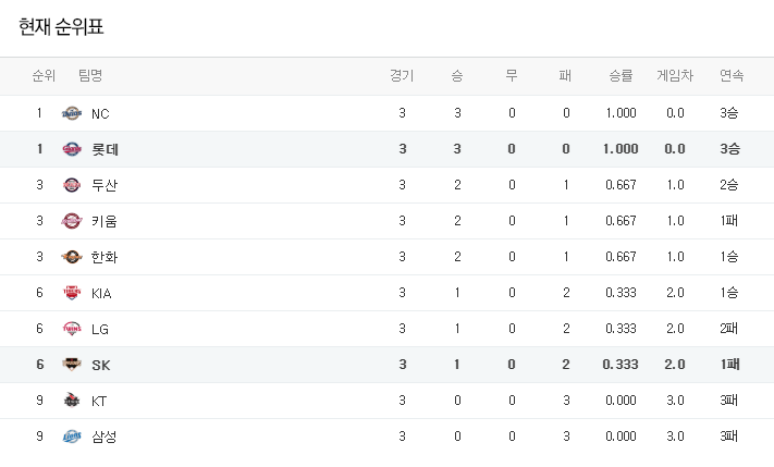 한화와의 개막 3연전에서 1승2패를 기록한 SK. 3경기 2홈런을 터뜨린 외야수 한동민의 타격감이 절정이라는 점. 노수광의 부진으로 기회를 얻은 외야수 정진기가 4타수 3안타로 맹타를 휘두르며 답답한 타선에 활력을 불어넣었지만 패하는 과정이 워낙 좋지 않았다. 15개의 안타를 때려내고도 많은 잔루를 기록하며 4득점에 그쳤고 6회초 2아웃 상황에서 4개의 안타와 4개의 볼넷을 허용하며 아웃 카운트 하나를 잡지 못해 대량실점을 허용하는 모습. 2차전 승리하는 과정에서도 마무리 하재훈이 흔들렸던 것을 고려하면 지난 시즌 SK의 강점이었던 불펜이 도리어 불안요소로 작용하고 있다고 볼 수 있다. 선발투수 문승원이 지난 시즌 11승7패 3.88의 성적으로 확실히 성장한 모습을 보였고 롯데전 3경기 1승 2.95로 롯데전 성적도 좋았지만 지난 시즌과는 달라진 롯데를 상대한다는 것이 변수다.