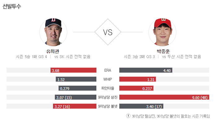 박종훈을 선발로 예고했다. 박종훈은 최근 2경기 연속 4+실점을 내주며 좋지 않은 피칭을 선보였다. 그러나 지난 5월 26일 두산 전에서는 7이닝 동안 단 2피안타 1자책점밖에 내주지 않았고, 8개의 탈삼진을 잡으며 두산 타자들을 압도했다. 최근 부진하고 있지만 두산에게 강했던 만큼 이번 경기에서 호투를 기대하기 충분하다.