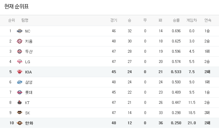 기아는 일요일 원정에서 키움 상대로 0-1 패배를 기록하며 시리즈 1승2패를 기록했다. 2연패 흐름 속에 시즌 24승21패 성적. 브룩스 투수가 최선을 다했지만 2경기 연속 2안타 빈공에 그쳤던 타선의 침묵으로 무득점 패배가 다시금 나왔던 경기. 반면, 한화는 일요일 홈에서 KT 상대로 4-8 패배를 기록하며 시리즈 1승2패를 기록했다. 2연패 흐름 속에 시즌 12승36패 성적. 채드벨 투수가 5연속 패전의 늪에 빠졌고 중심 타선의 파괴력도 떨어져 있다.