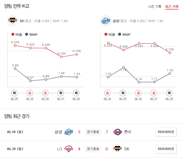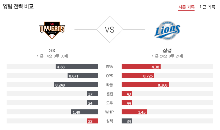 팀과 선발 투수의 최근 리듬에서 SK가 모두 열세에 있다. 삼성 승리 가능성을 추천 한다.