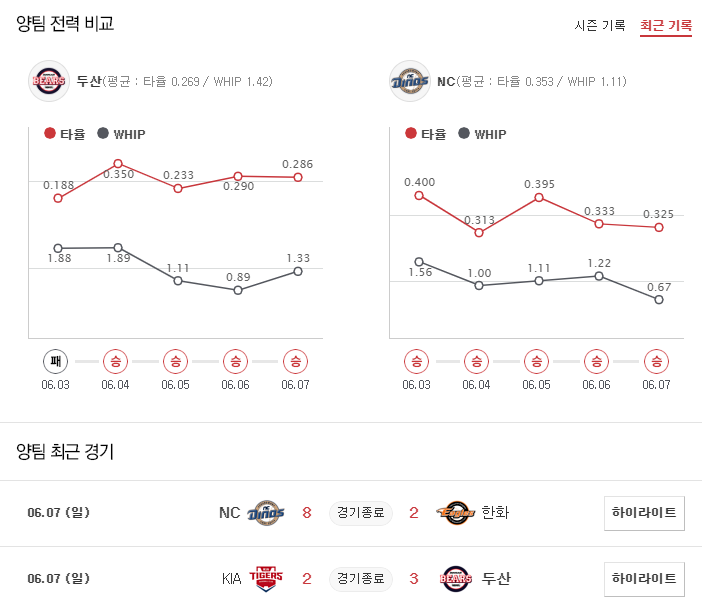 좌완투수 최성영이 등판하는 NC. 두산이 좌완투수에는 다소 약한 모습을 보여주고 있는 만큼 고졸 신인투수 조제영이 등판하는 두산과의 선발 대결에서도 우위를 기대할 수 있다. 더불어 지난 주 팀 OPS가 1.035에 이를 정도로 압도적인 타격을 보여주고 있는 NC의 기세를 고려하면 좌완투수에 약한 두산 상대로 1차전은 NC의 승리를 예상한다.