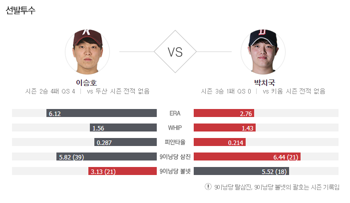 * 이승호, 리그 13경기 2승 4패 평자 6.12 / 두산 상대로 6이닝 5피안타 1실점