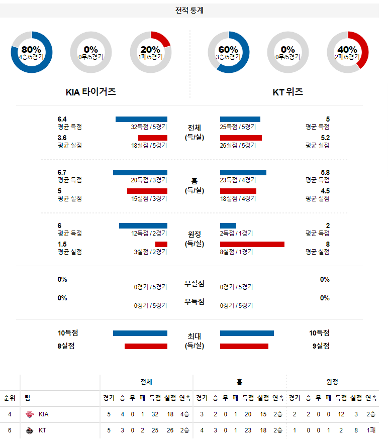 기아는 일요일 홈에서 삼성 상대로 8-5 승리를 기록하며 시리즈 2승을 기록했다. 4연승 흐름 속에 37승29패 성적. 같은 12안타, 4볼넷을 얻어낸 경기에서 홈런이 상대 보다 부족했지만 상위 타선에서 타점을 쓸어 담는 집중력을 선보인 경기. 반면, KT는 일요일 홈에서 NC 상대로 5-4 승리를 기록하며 시리즈 2승1패를 기록했다. 2연승 흐름 속에 34승1무33패 성적. 배정대가 2경기 연속 홈런포를 쏘아 올리는 가운데 구창모 투수를 상대로 3홈런 경기를 했고 2-4로 끌려가던 경기를 역전한 상황.