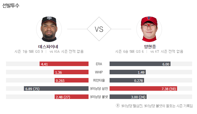 팀과 리그를 대표하는 에이스 투수가 되는 양현종 투수가 직전경기 승리를 기록하며 분위기 반전에 성공했다. 양현종 투수의 부진이 심리적인 문제가 많았던 만큼 직전경기 승리투가 우리가 알고 있던 양현종 투수의 모습을 나타나게 만들 것이다. 또한, 데스파이네 투수는 공이 긁히는 날에는 QS 이상의 투구를 보여왔지만 원정에서는 기복이 잇는 모습 이였고 휴식 시간이 양현종 투수 보다 짧았다. 기아 승리 가능성을 추천 한다.