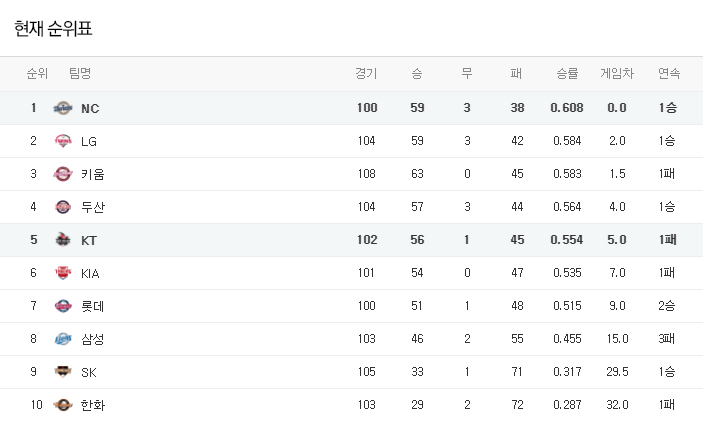 전일 경기에서는 NC가 13-8 승리를 기록하며 시리즈 기선제압에 성공했다. 59승3무38패 성적. 13안타(3홈런)을 기록하면서 8안타(4홈런)을 기록한 상대와 타격전에서 마지막에 웃었던 경기. 반면, KT는 56승1무45패 성적. 김민수 투수의 부진이 고민으로 남게 되었으며 4회초 까지 4-0, 리드를 잡은 경기를 역전 당했던 경기.