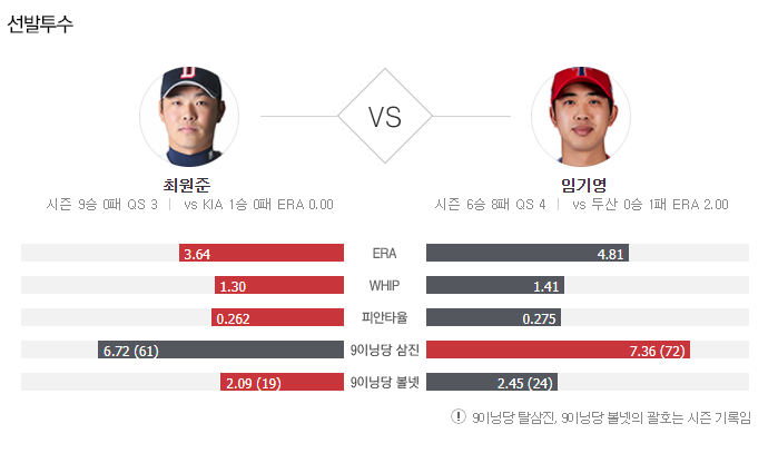 최원준 투수는 직전경기(9/5) 홈에서 SK 상대로 8이닝 1실점 승리를 기록했으며 이전경기(8/29) 원정에서 LG 상대로 3이닝 무실점 노디시전을 기록했다. 올시즌 선발 10경기+ 불펜으로 24경기에서 출격했으며 선발로서는 8승, 3경기 QS, 52.2이닝 14실점의 기록. 7월(6경기 2승, 2.65) 상대전 약점을 보였던 직전경기 NC를 상대로 아쉬움을 남겼지만 7월에 등판한 6경기중 5경기에서는 제몫을 해냈고 8월(5경기 4승, 3.24)과 9월 첫 등판에서 5승을 추가하는 상승세에 있다. 올시즌 원정에서 6승 3.70, 상대전 3경기 1승 0.00, 8.1이닝 무실점 기록이 있다.