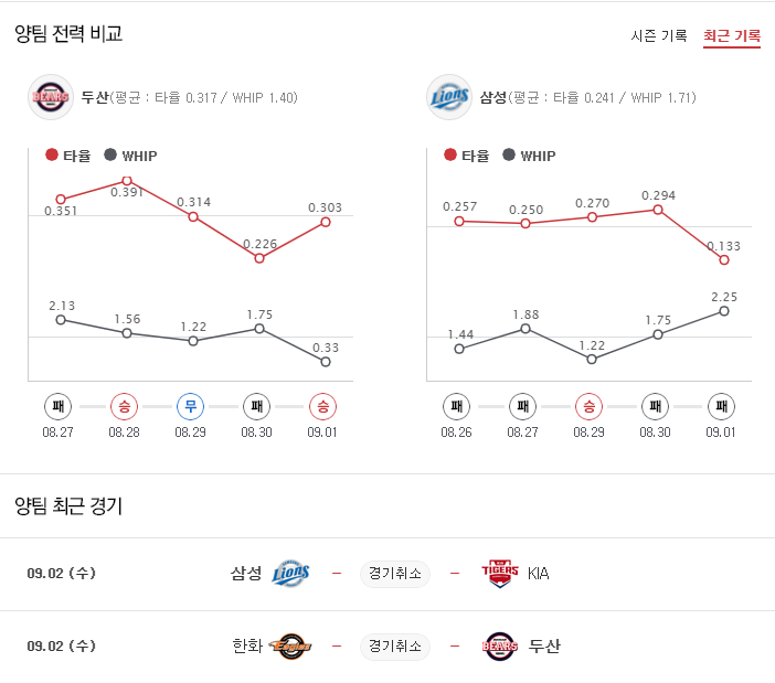 삼성은 화요일 원정에서 기아 상대로 0-6 패배를 기록하며 시리즈 1패를 기록했다. 2연패 흐름 속에 43승1무52패 성적. 4안타 빈공에 그쳤고 선발 싸움에서 밀리면서 소극적인 불펜의 운영을 가져갈수 밖에 없었던 탓에 추가 실점이 늘어났던 경기. 반면, 두산은 화요일 홈에서 한화 상대로 4-0 승리를 기록하며 시리즈 1승을 기록했다. 53승3무41패 성적. 8월 승리가 없었던 알칸타라 투수가 승리투로 기분 좋게 9월을 시작했고 마무리로 변신한 이영하 투수가 뒷문을 책임진 경기.